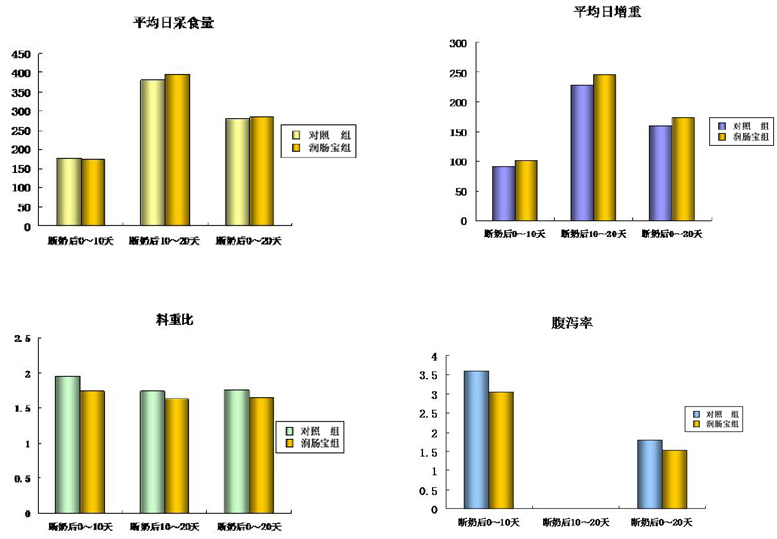 与对照组相比,添加0.1%润肠宝断奶后仔猪,提高平均日采食量4% ;提高平均日增重9%;降低料肉比5.0% ;减少腹泻发生率8%。